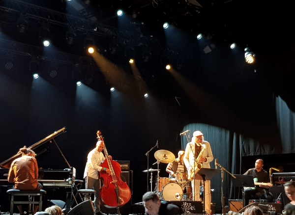 * * * *1/2Zweifel an Lloyd waren zum Glück aber nicht angebracht – aber sowas von nicht! Seine Band spielte mit demselben Fokus, derselben Konzentration auf, wie am Vorabend die Bands von Murray und Akinmusire. BAAMM! und los geht’s, nach Sekunden war man mitten drin, und auch der Veteran, dessen leichte Detachiertheit im Gegensatz zu Liebman keine kühle oder gar kalte ist, eher eine etwas esoterisch-versonnene (ist mir an sich auch nicht sympathischer), wurde durch das zupackende Spiel der Band locker wettgemacht, und bald war auch Lloyd mittendrin im Strom. Er stellte sich aber auch gerne hinter Clayton an den Rand der Bühne und liess seinen vier Sidemen viel Raum. Clayton und Sewell – warum es die Gitarre in der Band braucht, begreife ich nicht, aber bei den Ergebnissen wird die Frage auch obsolet – spannen über weite Strecken am selben Faden, Klavier und Gitarre verzahnten sich so eng, dass sie oft wie ein einziges Instrument klangen – was total faszinierend war und zu einem Gesamtklang führte, wie er dann eben doch ziemlich ungewöhnlich war. An Stücken war mir nur der Lloyd-Perennial „Sweet Georgia Bright“ vertraut, aber das Material, das Lloyd seit den 90ern so spielt, ist für mein Empfinden kompositorisch auch sehr unprägnant – der Fokus liegt eben nicht auf dem Material sondern aus den Performances, und die hatten es auch an diesem Abend in sich. Harland/Rogers waren vielleicht die beste Rhythmusgruppe des Festivals, auch wenn sie nicht mit den allerbesten der heutigen Tage mithalten können – aber das war schon verdammt gut! Und Lloyd, wie erwähnt, stand nach einer Viertelstunde mittendrin, eine Art Kobold und Hexenmeister, der zwar die coole Pose nicht verlernt hat aber doch sichtlich genoss, was da passierte.