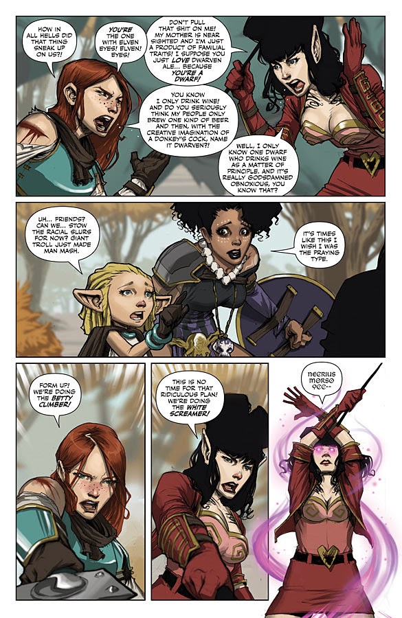Flow like a harpoon daily and nightlyBei den „Indies“ sollte man wirklich mal in „Rat Queens“ reinschauen. Ich hatte erst so meine Zweifel, weil ich mit Humor in Comics fast gar nichts anfangen kann und ich dachte, dass ich mich an den Zeichnungen stören könnte, aber das Gegenteil ist der Fall: Sie sind perfekt. Dazu unglaublich witzige Dialoge und vier Heldinnen, die saufen, Drogen nehmen und sich gerne mal prügeln. Und „Rat Queens“ ist GORY!